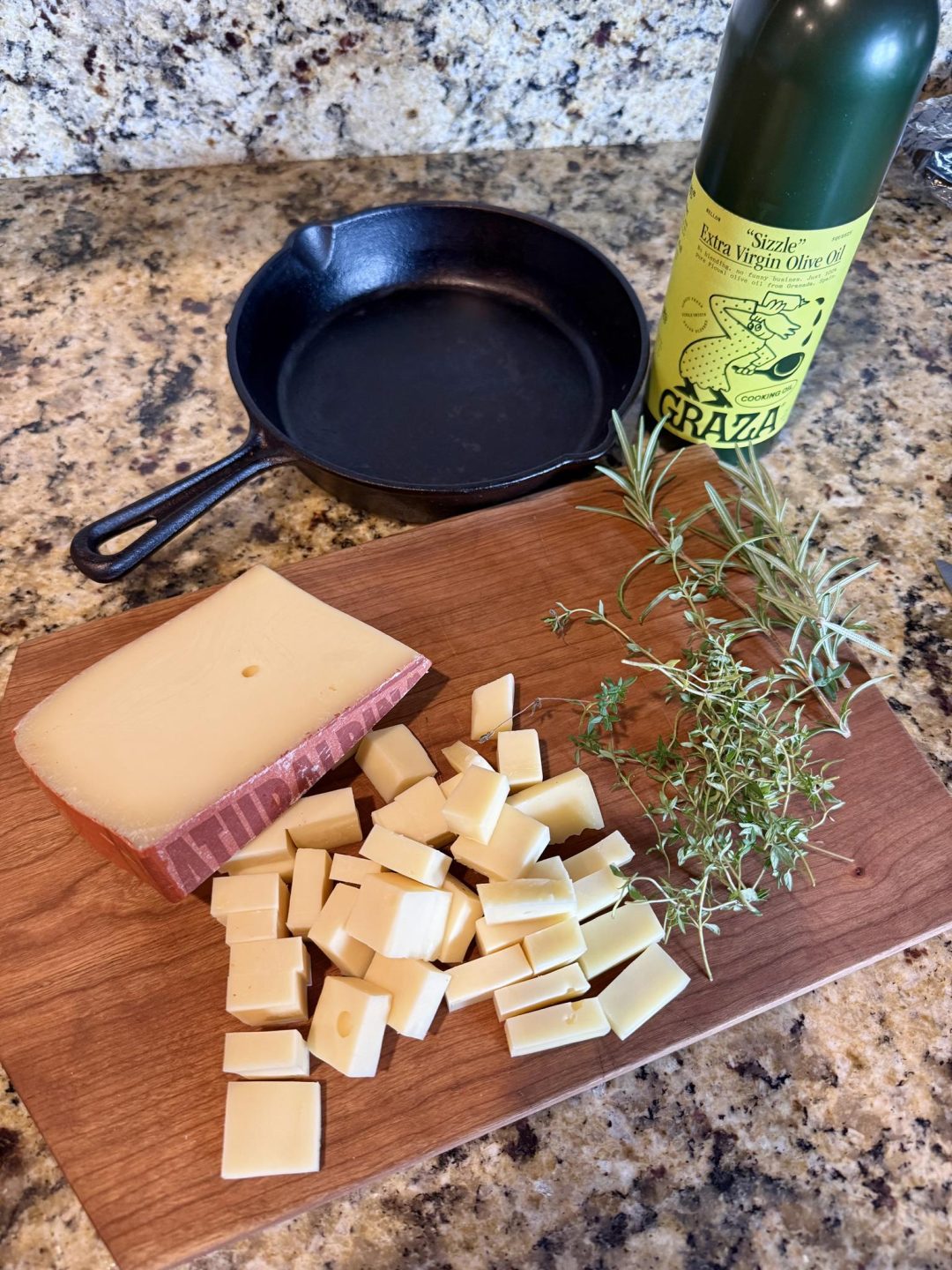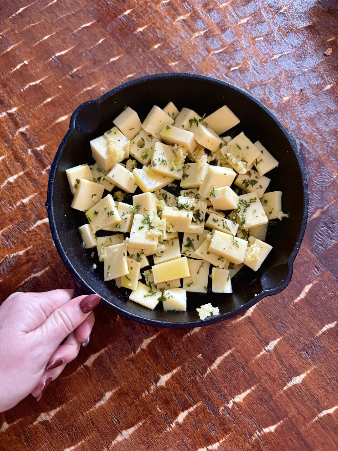 - Combine ingredients: Place the cubed fontina in a small cast iron skillet or other oven-safe baking dish. Drizzle with olive oil, then sprinkle the minced garlic and herbs over the cheese.